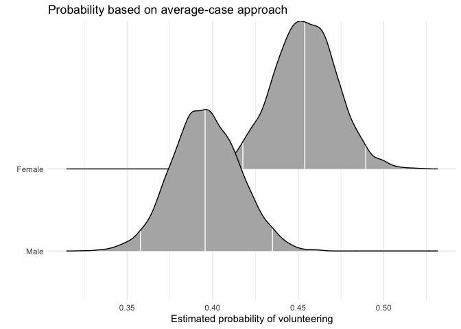 We first calculate the average “effect” of sex on volunteering, again generating a full posterior distribution. Again, xcol represents the position of the covariate of interest, and xrange specifies the values for which Pr(y = 1) is to be calculated.