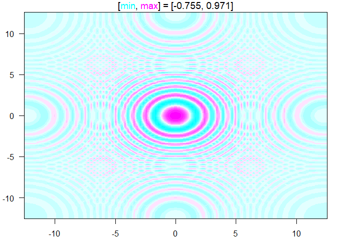 f1 <- function(r) cos(r[1]^2 + r[2]^2)*exp(-sqrt(r[1]^2 + r[2]^2)/(2*pi))