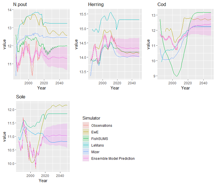either be a point estimate or a full sample.We illustrate this process with datasets included with the package. EcoEnsemble comes loaded with the predicted biomasses of 4 species from 4 different mechanistic models of fish populations in the North Sea. It also includes statistical estimates of the biomasses from single-species stock assessments, and covariances for the model outputs and assessments. The models are run for different time periods and different species.