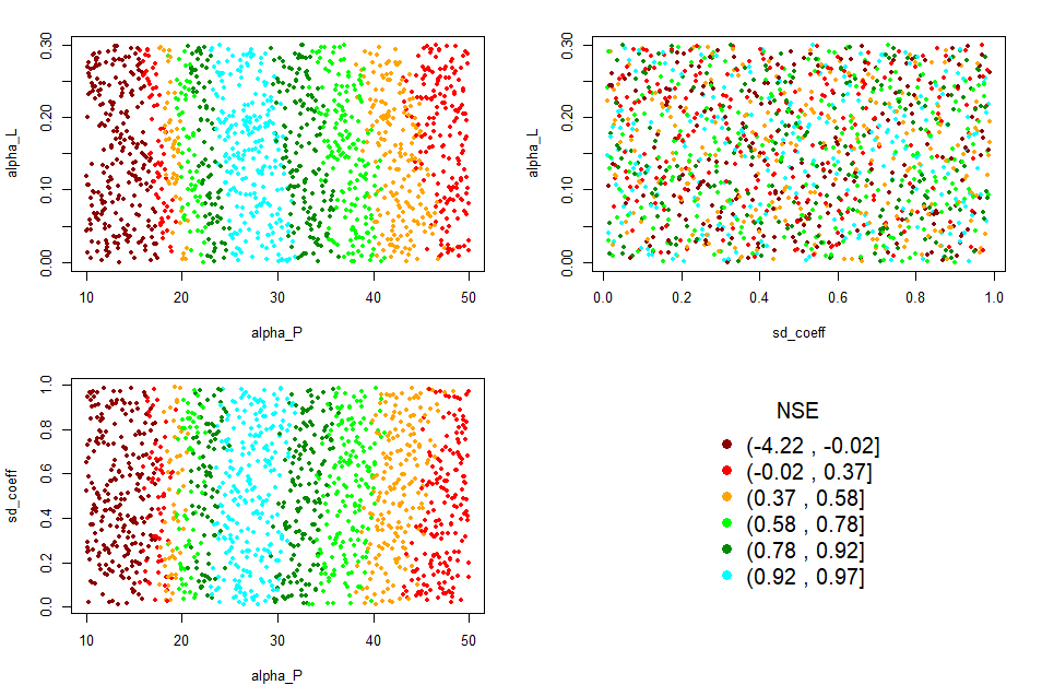 DF_calib_TN <- calib_green(catch_data_TN, annual_data_TN, n_iter, low, upp, years)The calibration function applies a Latin Hypercube sampling scheme to the three parameters within the possible range (defined by lower and upper limits) and evaluates model performance (predictions against available observations) for the calibration period (specified in years) by calculating several “goodness-of-fit” metrics. The function returns a data frame with parameters and goodness-of-fit scores that can be further analyzed.