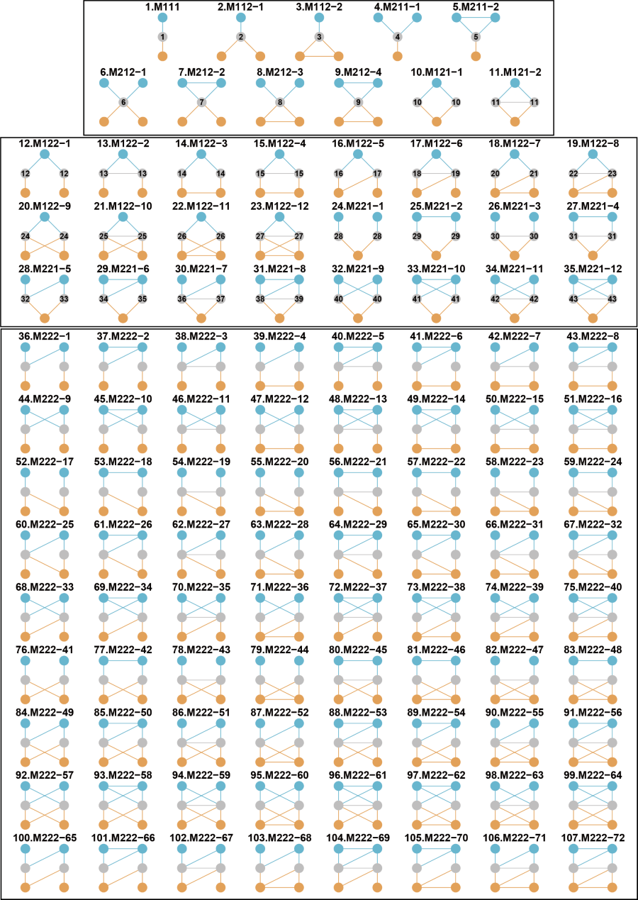 Fig. 4. The 107 forms of interconnection motifs with intra-guild interactions. Each guild contains only two nodes at most. Blue and grey nodes from one subnetwork, and grey and orange nodes from the other subnetwork. Grey nodes are connector nodes.