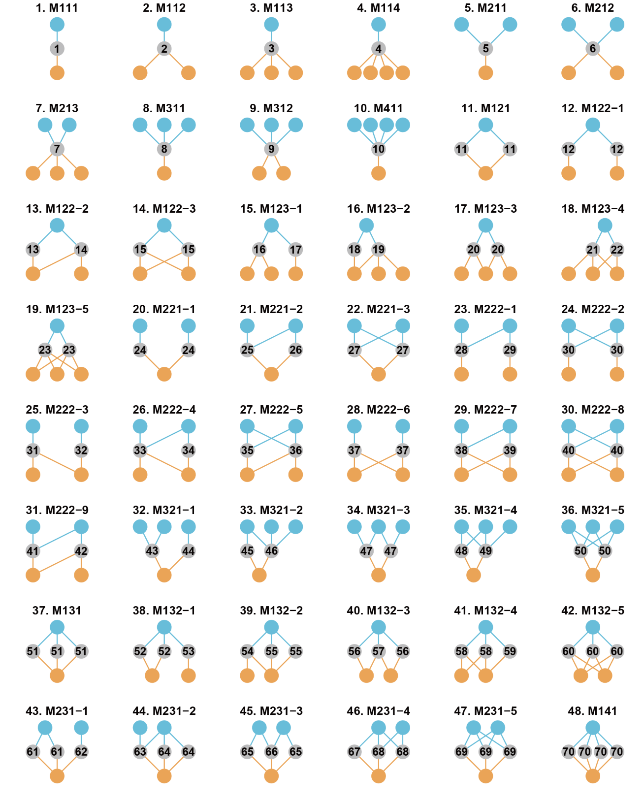 Fig. 2. The 48 forms of interconnection motifs with 3-6 nodes and no intra-guild interactions. Blue and grey nodes from one subnetwork, and grey and orange nodes from the other subnetwork. Grey nodes are connector nodes.
