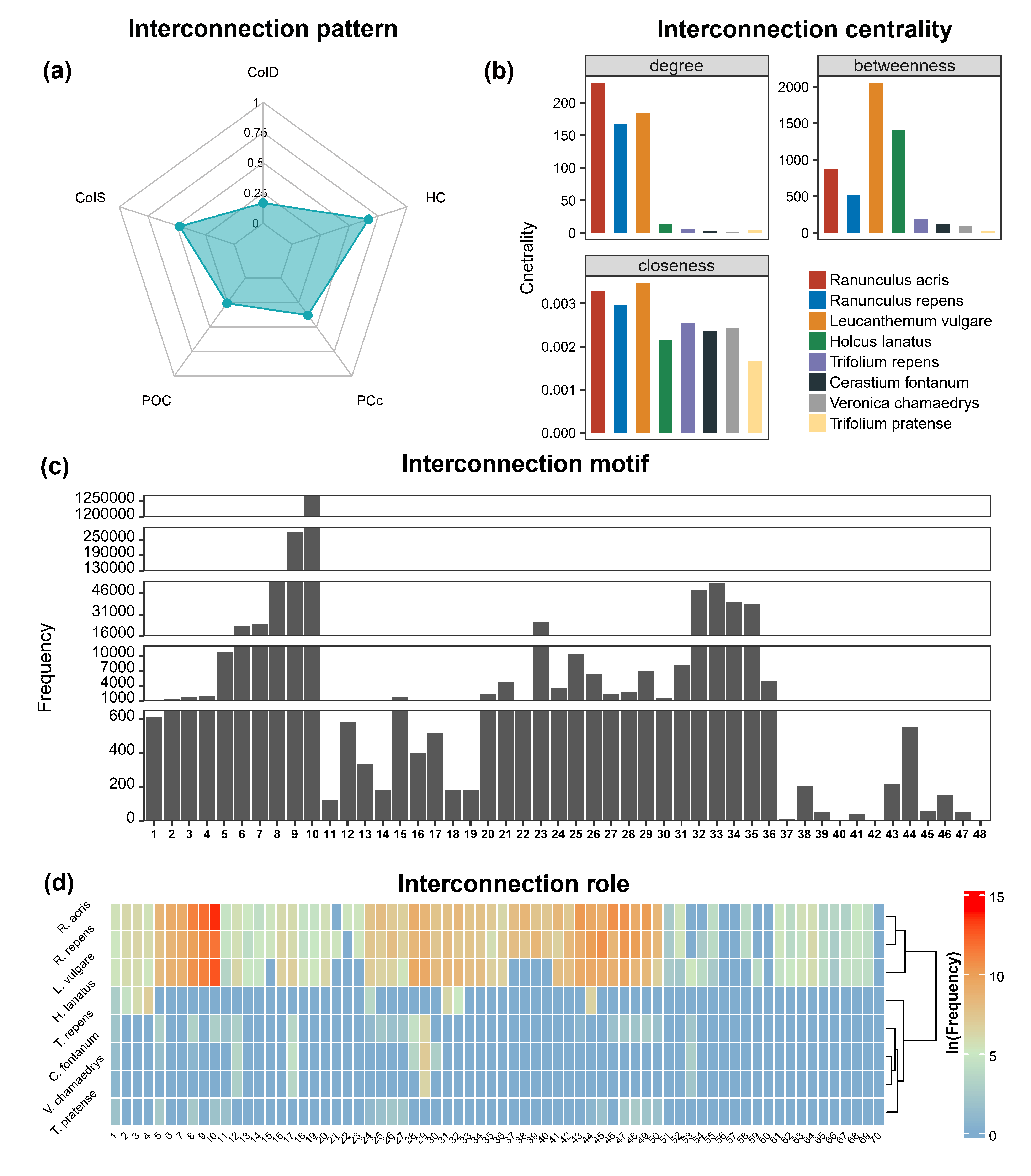 Fig. 3. The interconnection structures of the example PPH network. (a) Five interconnection patterns. (b) Three interconnection centrality indices for eight connector species. (c) The frequencies of 48 interconnection motifs. (d) The frequencies (ln-transformed) of 70 roles for eight connector species in the interconnection motifs. See codes for plotting in the vignette.