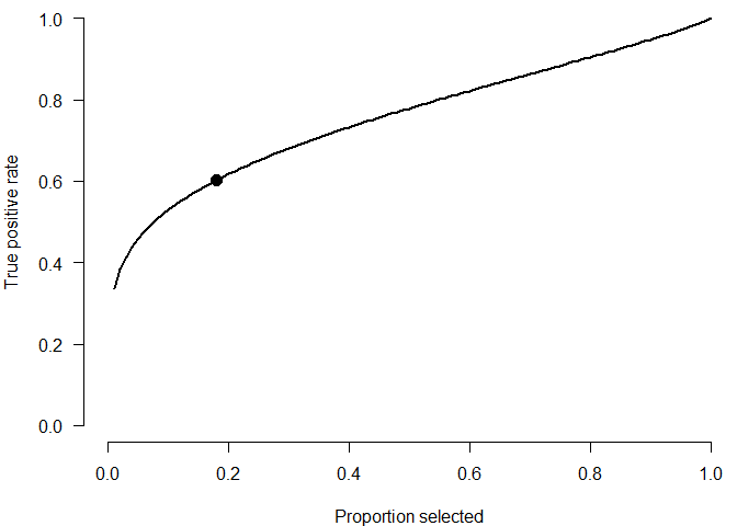 plot(NA, type = "n", axes = TRUE, bty = "n", xlab = "Proportion selected", ylab = "True positive rate", xlim = c(0, 1), ylim = c(0, 1), las = 1)