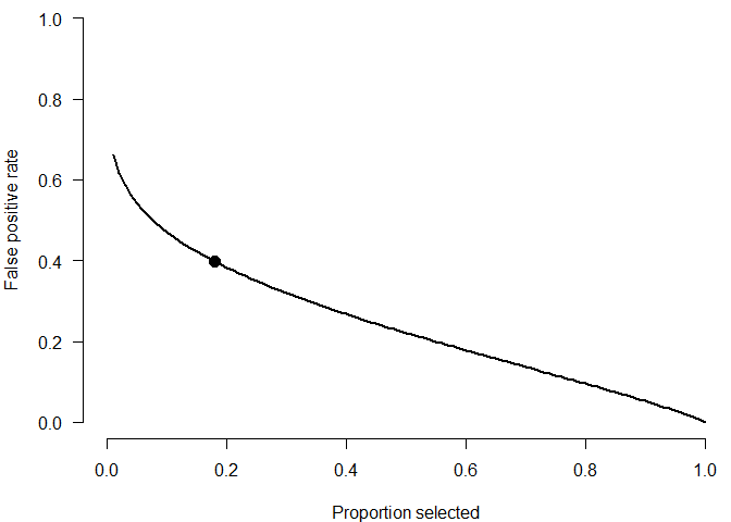 plot(NA, type = "n", axes = TRUE, bty = "n", xlab = "Proportion selected", ylab = "False positive rate", xlim = c(0, 1), ylim = c(0, 1), las = 1)