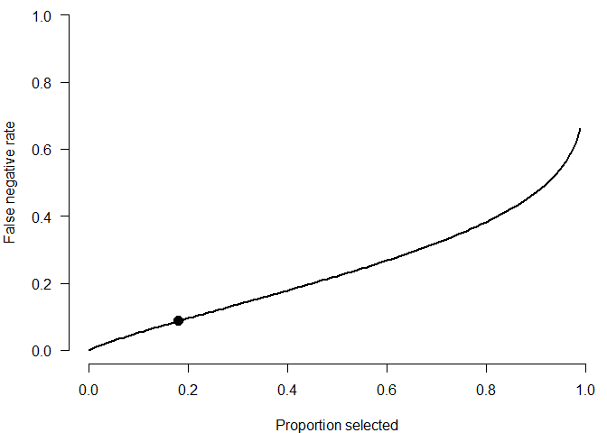 points(prop_sel, compute_false_negative_rate(IRR = IRR, proportion_selected = prop_sel), pch = 16, cex = 1.5)