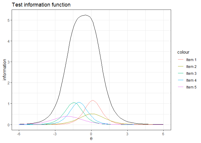 labs(title="Test information function", x=expression(theta), y='information')+