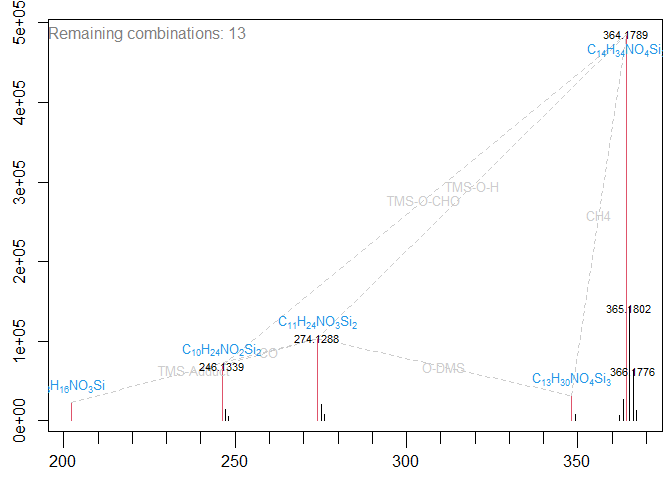 #> 364.1789 "C14H34N1O4Si3" "C15H34N1O3S1Si2" "C12H32N4O3Si3" "C15H30N1O7Si1"