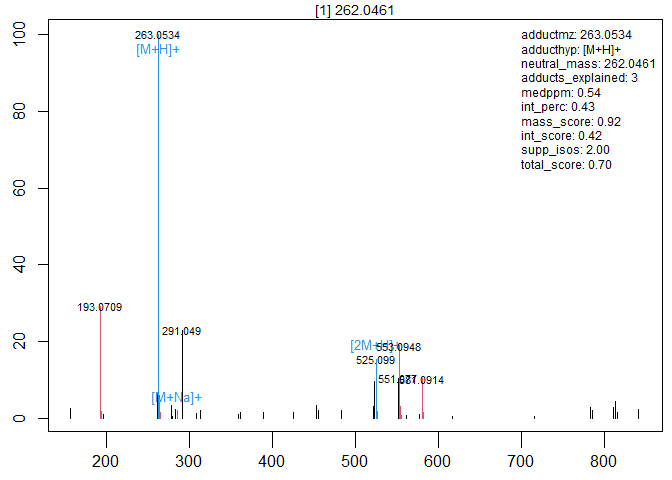 #> Selected m/z=263.0534 as [M+H]+ adduct of neutral mass 262.0461 with score 0.70.
