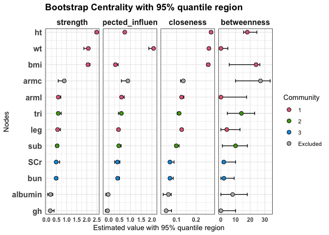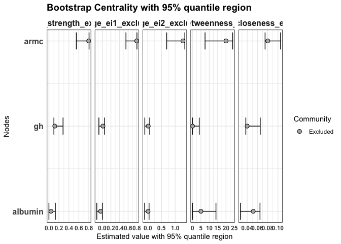 We can compute standard node centrality indices (strength, expected influence, closeness, and betweenness) together with their 95% quantile regions.