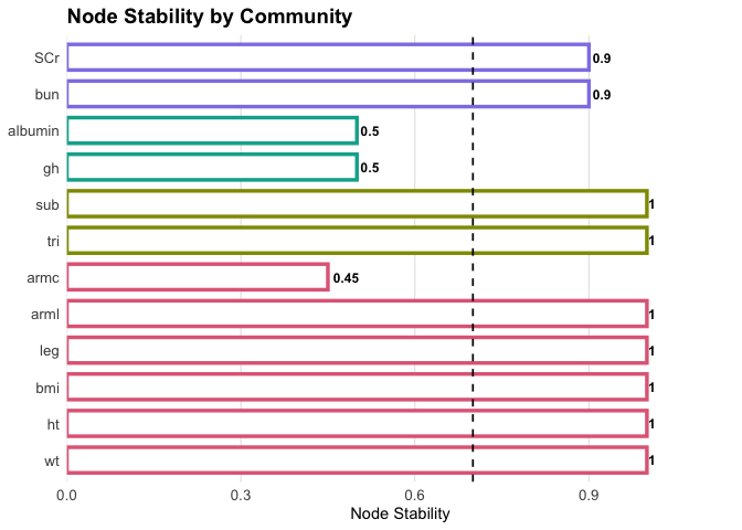 Nodes with stability < 0.70 are retained in the network but excluded from the clustering (they will appear in grey). Singletons are also excluded from communities.