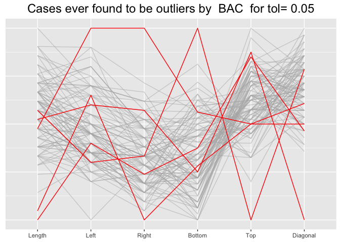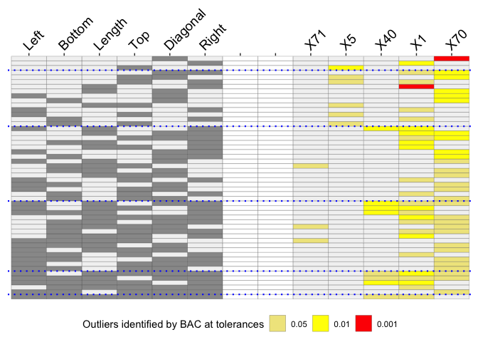 The method mvBACON from robustX has been used to identify possible outliers. There are 6 numeric measurements of the notes, so there are 63 possible variable combinations. An O3 plot has one row for each variable combination for which outliers were found and those variables are specified by the relevant columns on the left of the plot. The cases identified as outliers for at least one combination each get a column to the right of the plot.