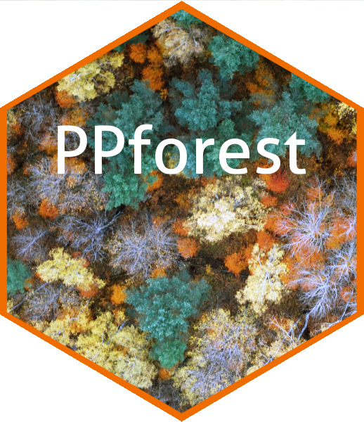 PPforest function runs a projection pursuit random forest.The arguments are a data a data.frame object with the data information, y a character with the name of the class variable. size.tr to specify the proportion of observations using in the training. Using this function we have the option to split the data in training and test internally in the forest and the PPforest object reports both errors. size.tr is the proportion of data used in the training and the test proportion will be 1- size.tr. The number of trees in the forest is specified using the argument m. The argument size.p is the sample proportion of the variables used in each node split, PPmethod is the projection pursuit index to be optimized, two options LDA and PDA are available. The algorithm can be parallelized using parallel and cores arguments.