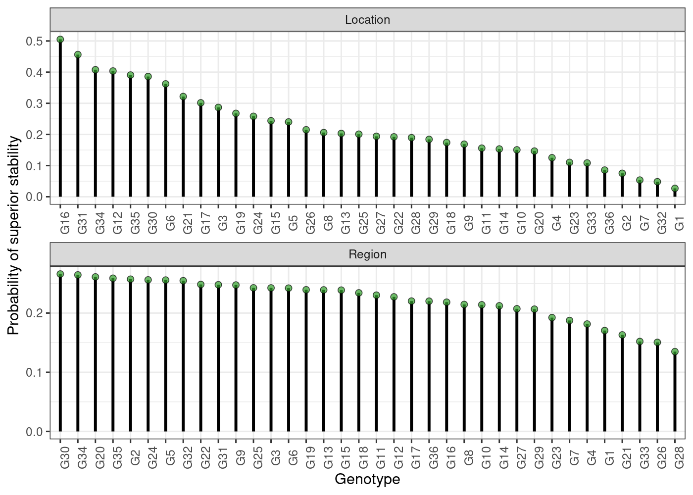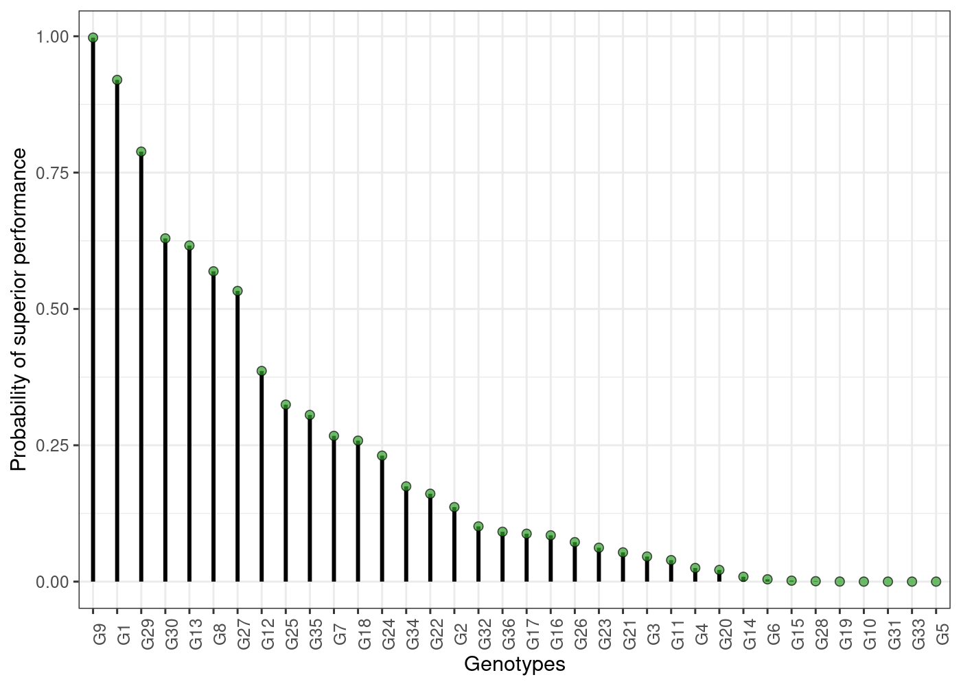 ProbBreed employs Bayesian statistics to analyse multi-environment trials’ data, and uses its outputs to estimate the marginal and pairwise probabilities of superior performance and superior stability of the genotypes, as well as their conditional probability of superior performance. The method is thoroughly described at https://doi.org/10.1007/s00122-022-04041-y.