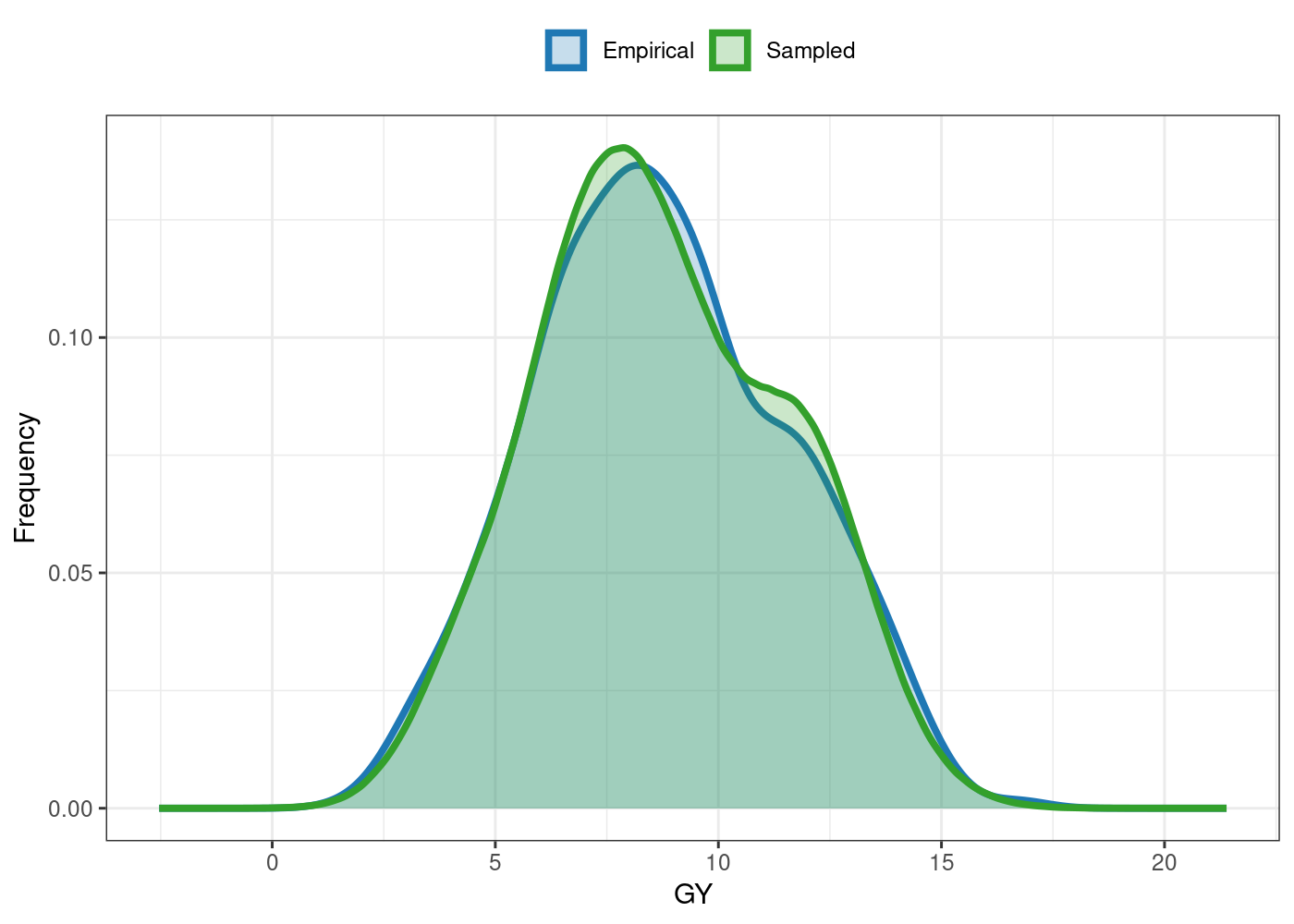 You can also the plot S3 method for some useful visualizations. For e.g., the comparison between the empirical and sampled phenotype illustrates the model’s convergence: