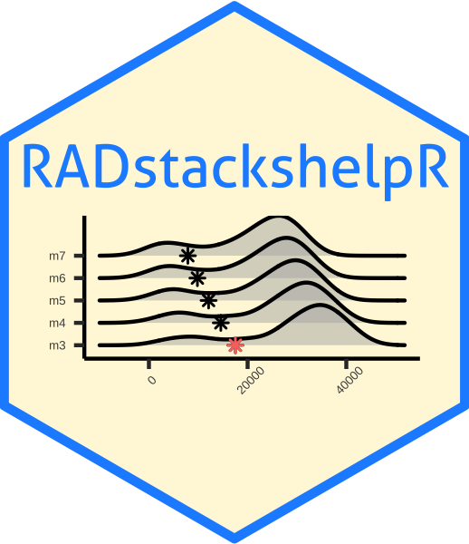 devtools::install_github("DevonDeRaad/RADstackshelpR")The first step is demultiplexing your sequence data using the ‘process_radtags’ function from STACKS, which could be executed by running something like this in a terminal window, if your raw sequence file is in your working directory, and you used the enzyme ‘ndeI’ as your cutter: