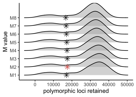 #> while the asterisk denotes the total number of loci retained at an 80% completeness cutoff. The optimal value is denoted by red color.