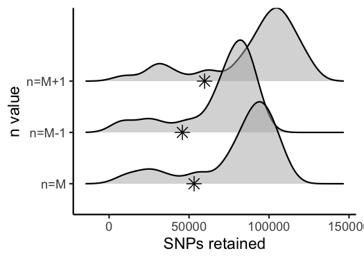 #> Density plot shows the distribution of the number of loci retained in each sample,