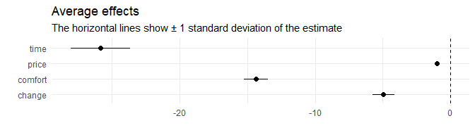 #> Level: Utility differences with respect to alternative 'B'.