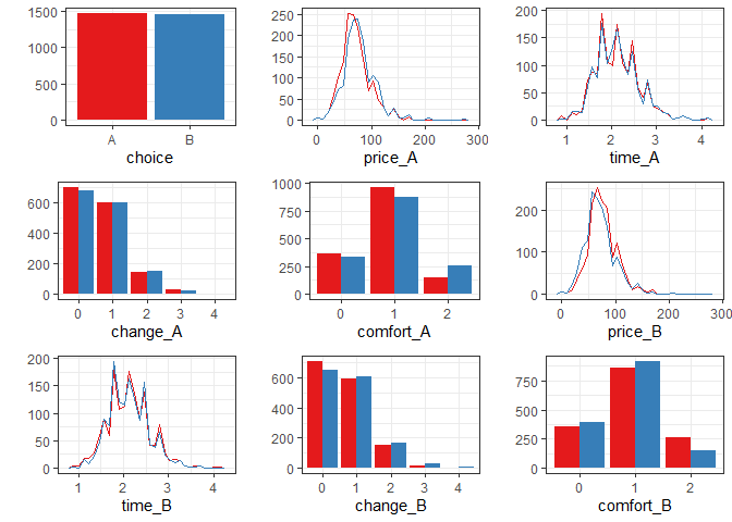 #> Documentation: https://loelschlaeger.de/RprobitBWe analyze a data set of 2929 stated choices by 235 Dutch individuals deciding between two virtual train trip options based on the price, the travel time, the level of comfort, and the number of changes.