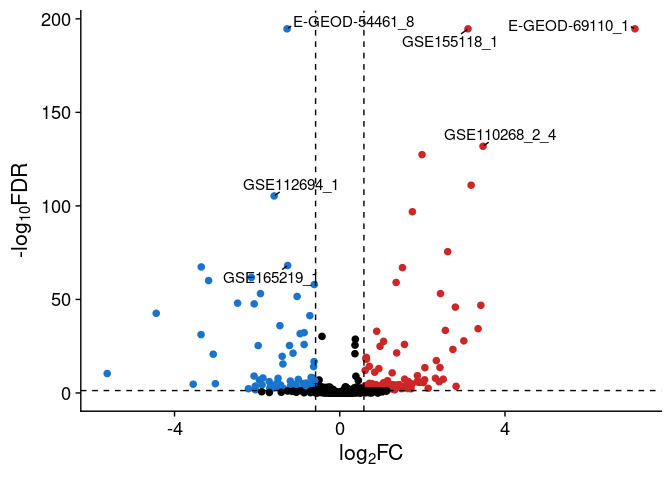 #> 3 E-GEOD-5… -1.28 2.25e-195 SOX9 E-GEOD-5… Day18vsDay2 "Temporal …