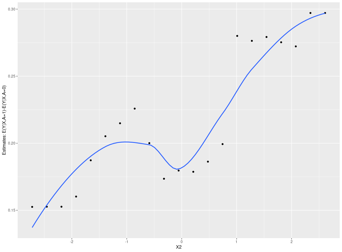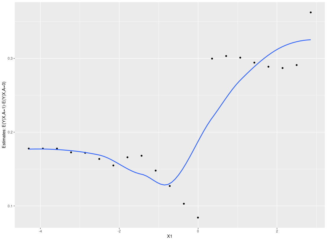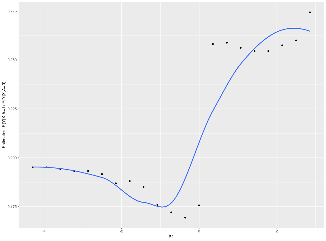 2. Patient-level estimate (ple_train): Estimate counterfactual patient-level quantities, for example the conditional average treatment effect (CATE), E(Y|X=x, A=1)-E(Y|X=x,A=0).