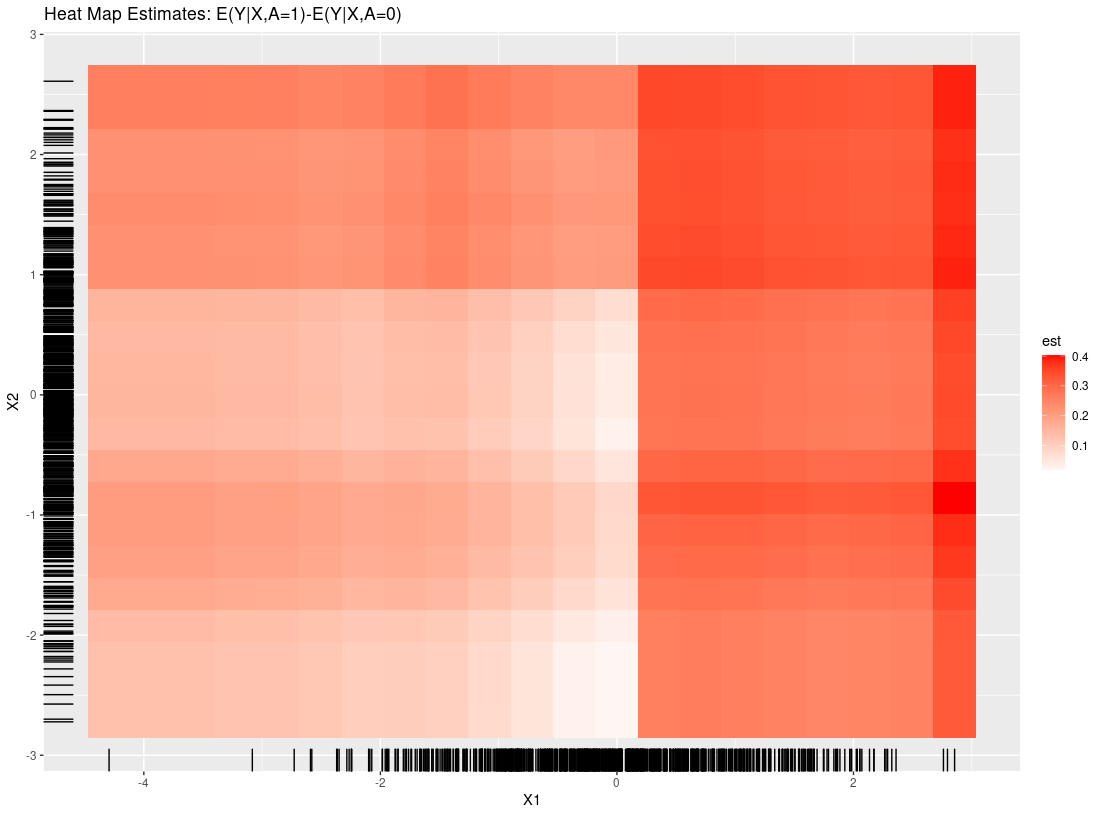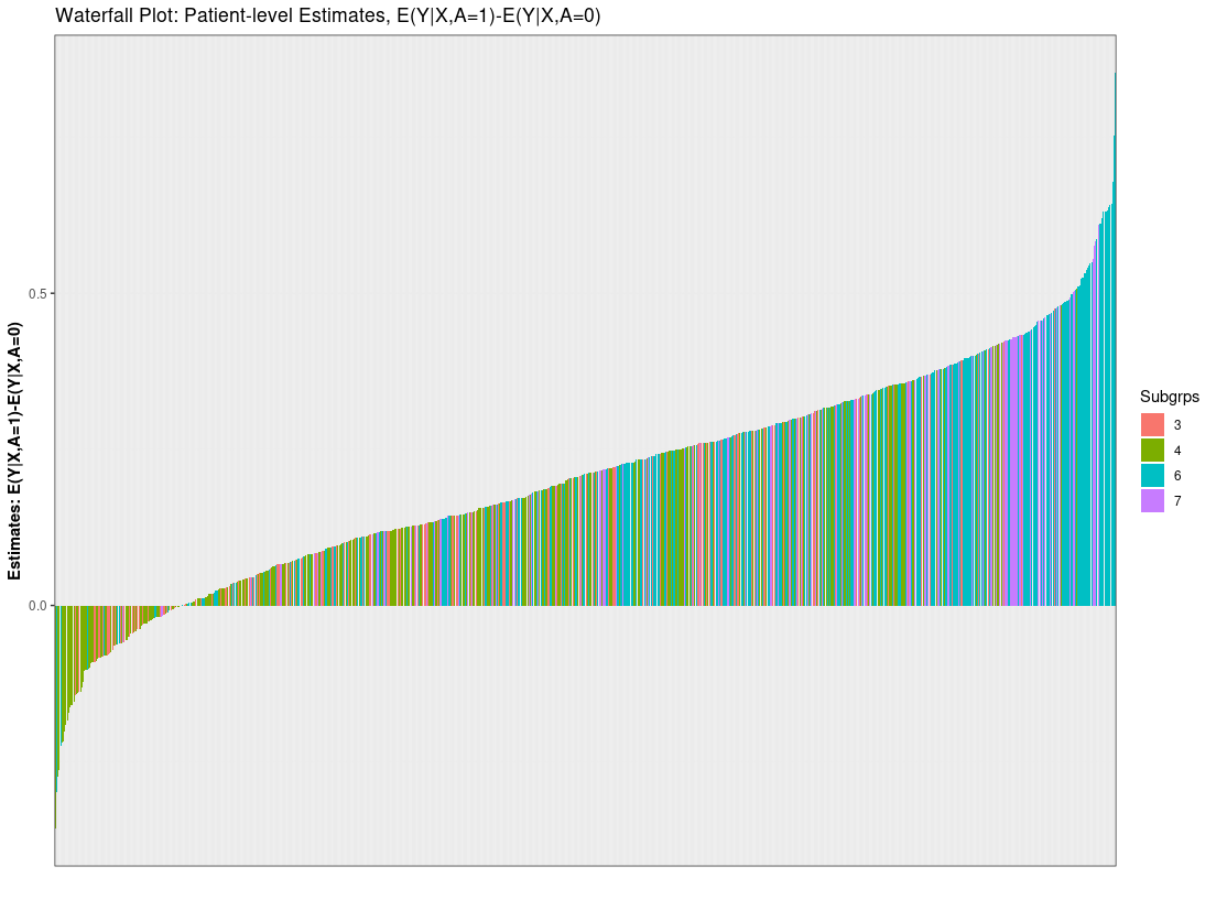 Suppose the estimand or question of interest is the average treatment effect, E(Y|A=1)-E(Y|A=0). The goal is to understand whether there is any treatment heterogeneity across patients and if there are any distinct subgroups with similar responses. In this example, we simulate continuous data where roughly 30% of the patients receive no treatment-benefit for using A=1 (study treatment) vs A=0 (control). Responders (should receive study treatment) vs non-responders (should receive control) are defined by the continuous predictive covariates X1 and X2 for a total of four subgroups. Subgroup treatment effects are 0 (X1 <= 0, X2 <= 0), 0.25 (X1 > 0, X2 <= 0), 0.45 (X1 <= 0, X2 > 0), 0.65 (X1 > 0, X2 >0)