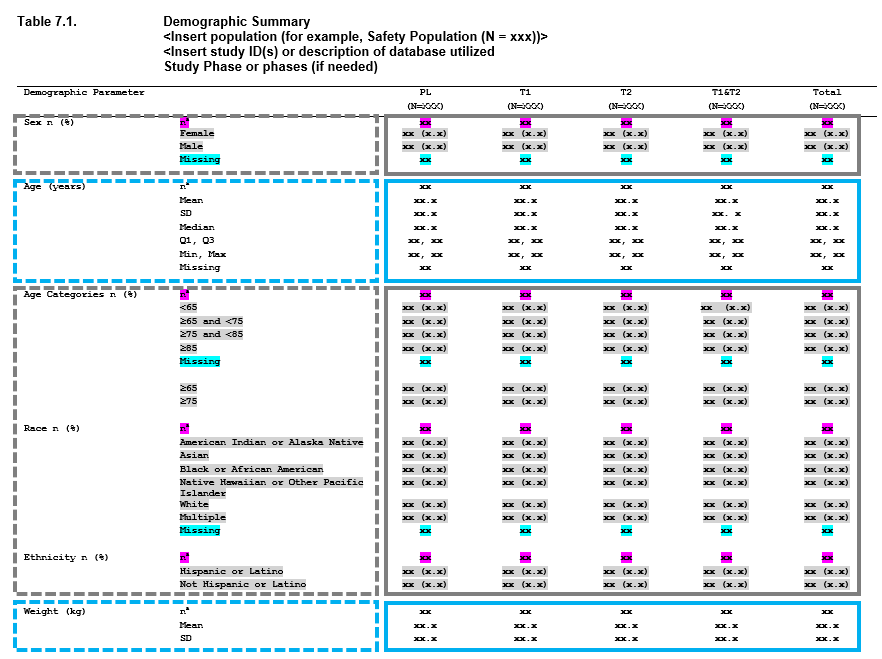 For many of the tables that go into a clinical submission, the tables are made up of a combination of these approaches. Consider a demographics table - and let’s use an example from the PHUSE project Standard Analyses & Code Sharing - Analyses & Displays Associated with Demographics, Disposition, and Medications in Phase 2-4 Clinical Trials and Integrated Summary Documents.