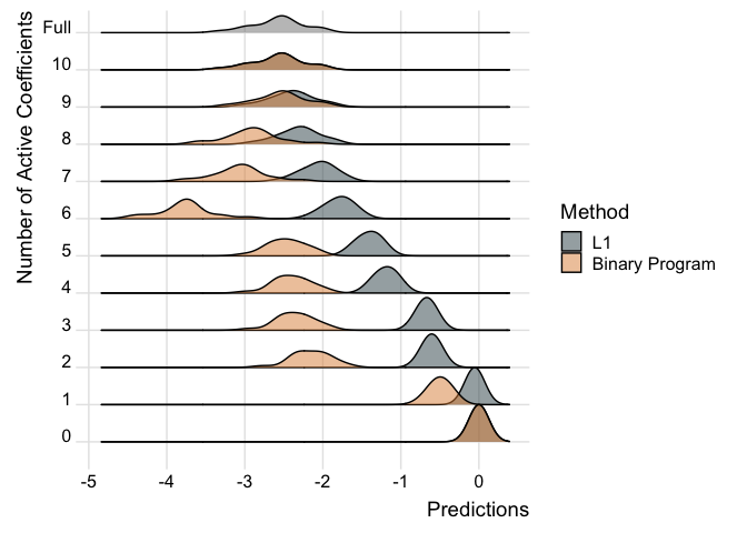 ridgePlot(list("L1" = fit.p2, "Binary Program" = fit.p2.bp), index = 21, minCoef = 0, maxCoef = 10, full = post_mu[21,])