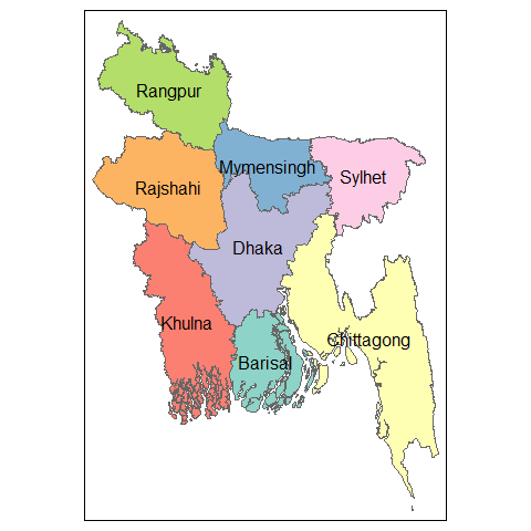 The bangladesh package provides ready-to-use shapefiles for different administrative regions of Bangladesh (e.g., Division, District, Upazila, and Union). Usually, it is difficult to plot choropleth maps for Bangladesh in R. This package will help users to draw thematic maps of administrative regions of Bangladesh easily as it comes with the sf objects for the boundaries and regions’ names in English. It also provides functions allowing users to efficiently get specific area maps and center coordinates for regions. Users can also search for a specific area and calculate the centroids of those areas.