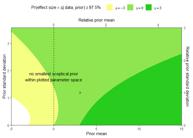 #> replace the existing one.The resulting RoE plot enables to evaluate the presence of the respective claim (colored areas) or their absence (white area) as a function of prior expected mean (x-axis) and prior standard deviation (y-axis) that could be used by an assessor. The cross marks the effect estimate that was used to construct the RoE. The dashed vertical line represents all the sceptical priors that assume the true effect around 0, with a varying degree of uncertainty.