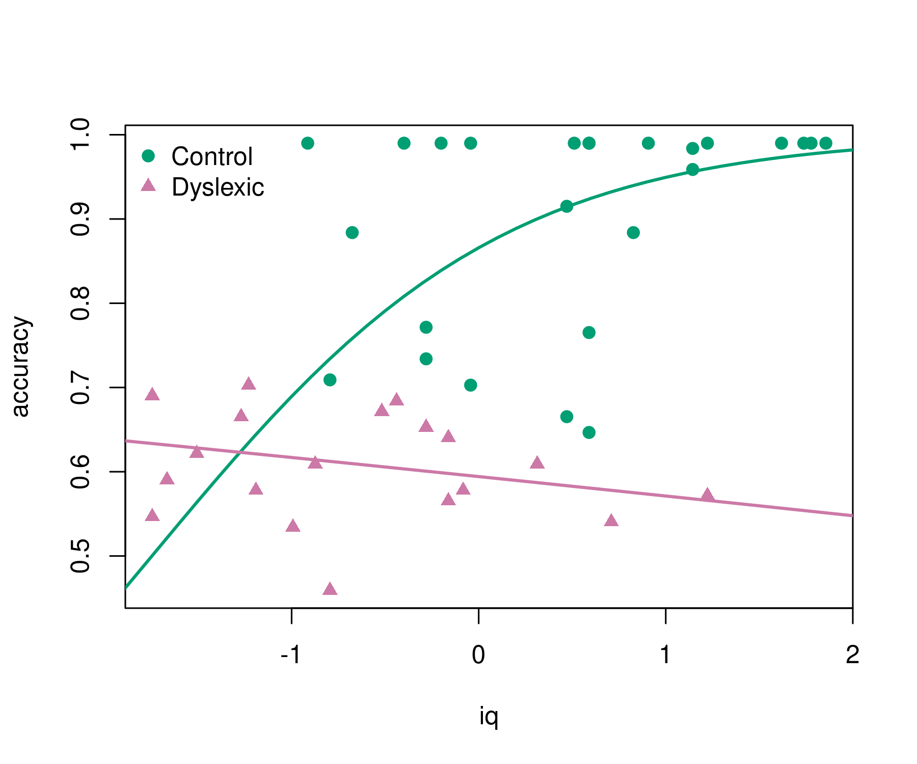 The regression summary shows that accuracy increases with iq for the control group but not for the dyslexic group (even slightly decreases). This can be brought out more clearly graphically. This also highlights that the model employs a logit link so that the fitted curves always remain within (0, 1).