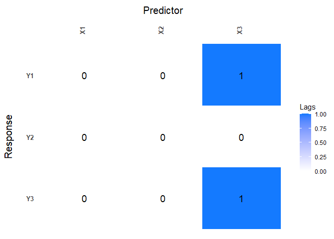 VARXcv <- sparseVARX(Y = scale(Y), X = scale(X), selection = "cv")