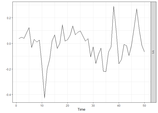 edist <- lag(Xsim$Y)[-1, ] + rnorm(periods + burnin, sd = 0.1)