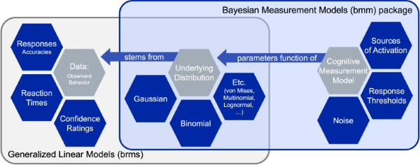 The goal of the bmm (Bayesian Measurement Models) package is to make it easier to estimate common cognitive measurement models for behavioral research. It achieves this by combining the flexibility of the brms (Bayesian Regression Models using Stan) package for specifying linear model syntax with custom functions that translate cognitive measurement model into distributional families that can be estimated using Bayesian hierarchical estimation.