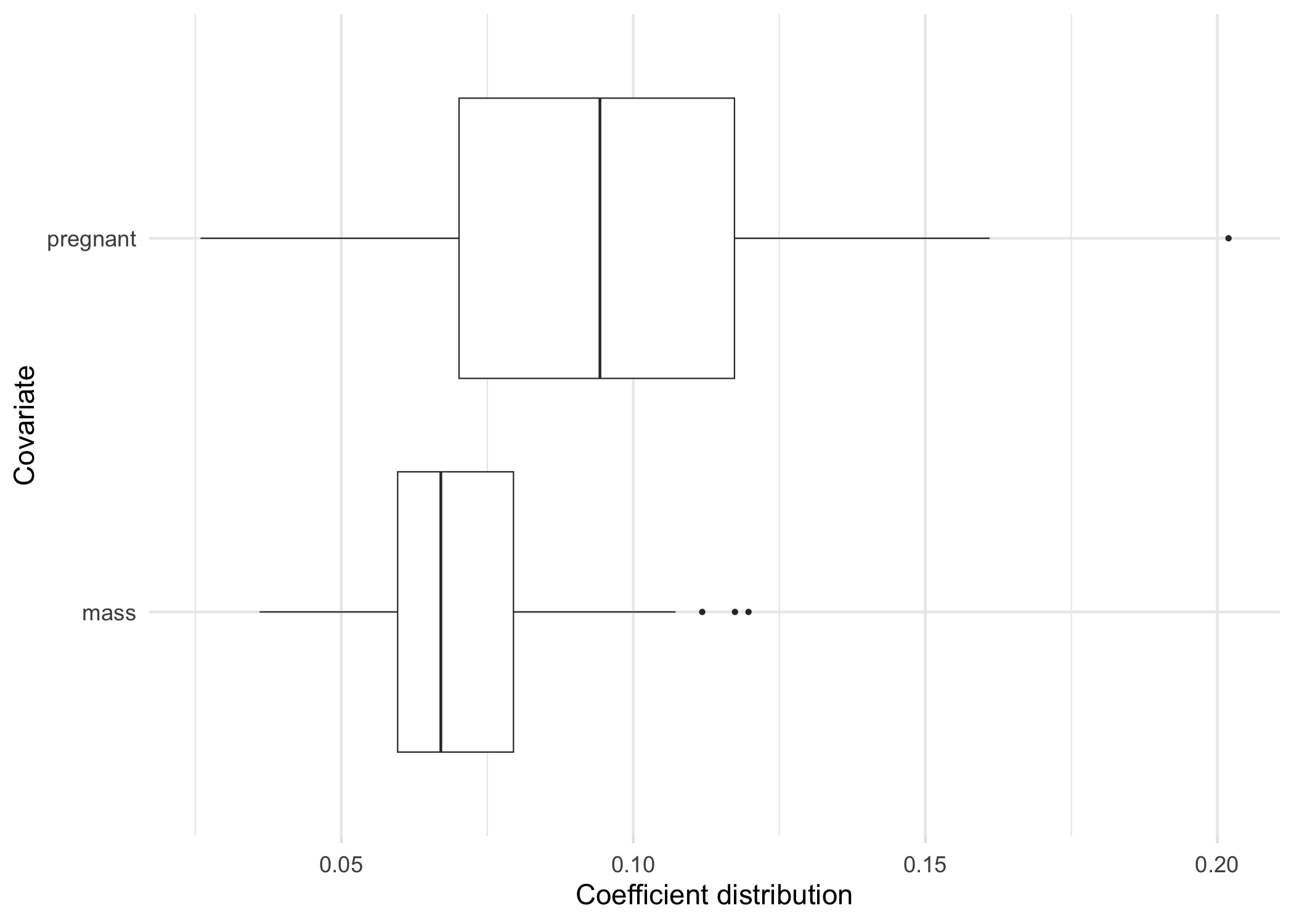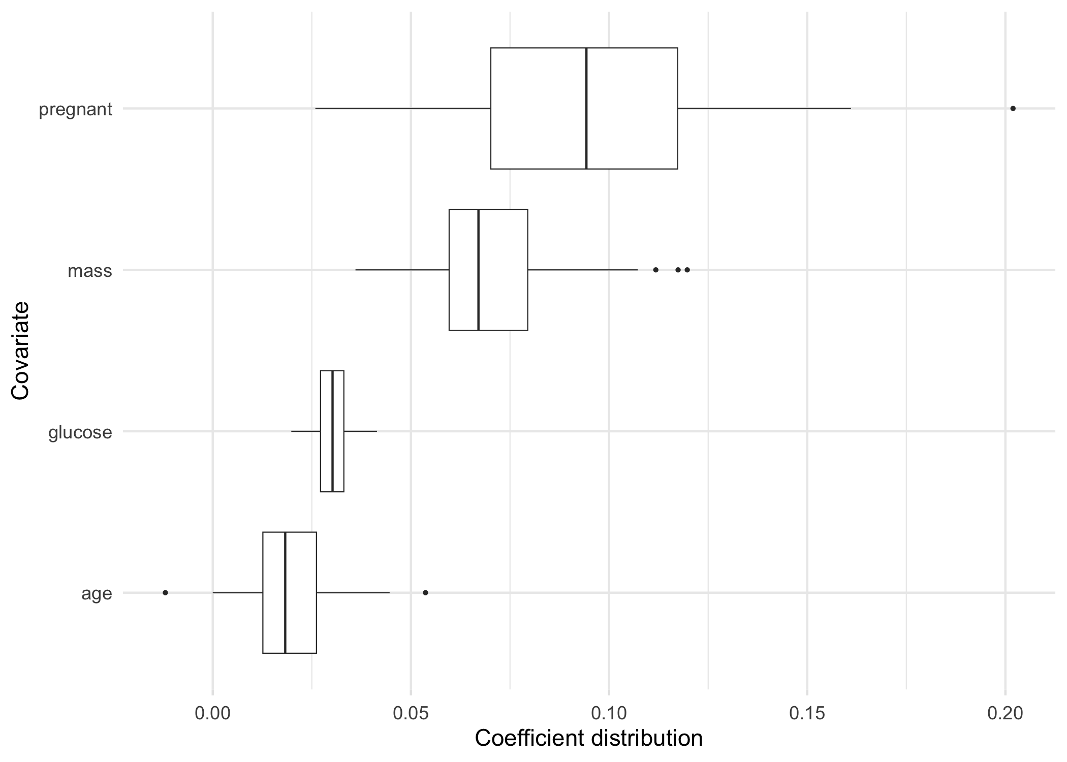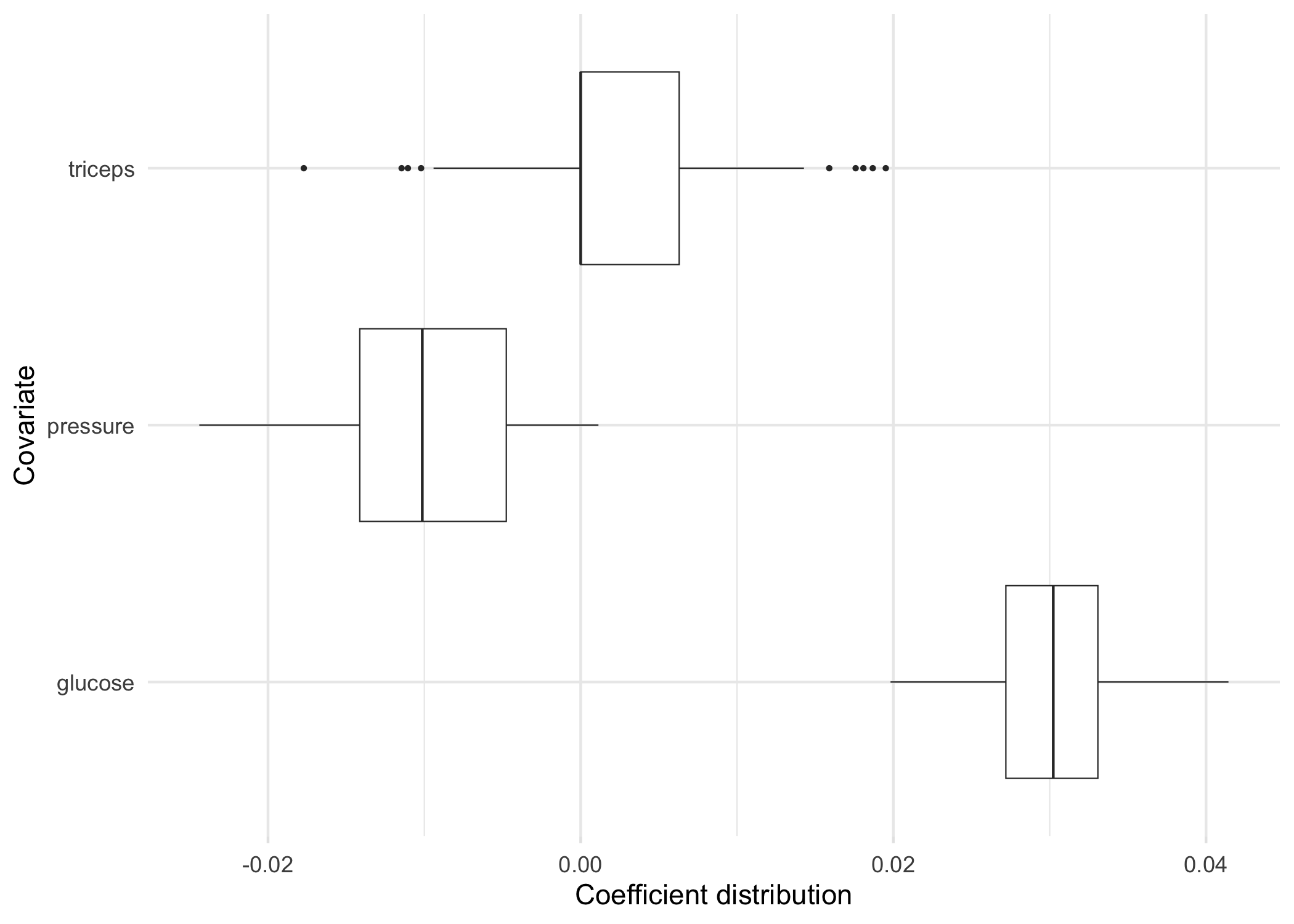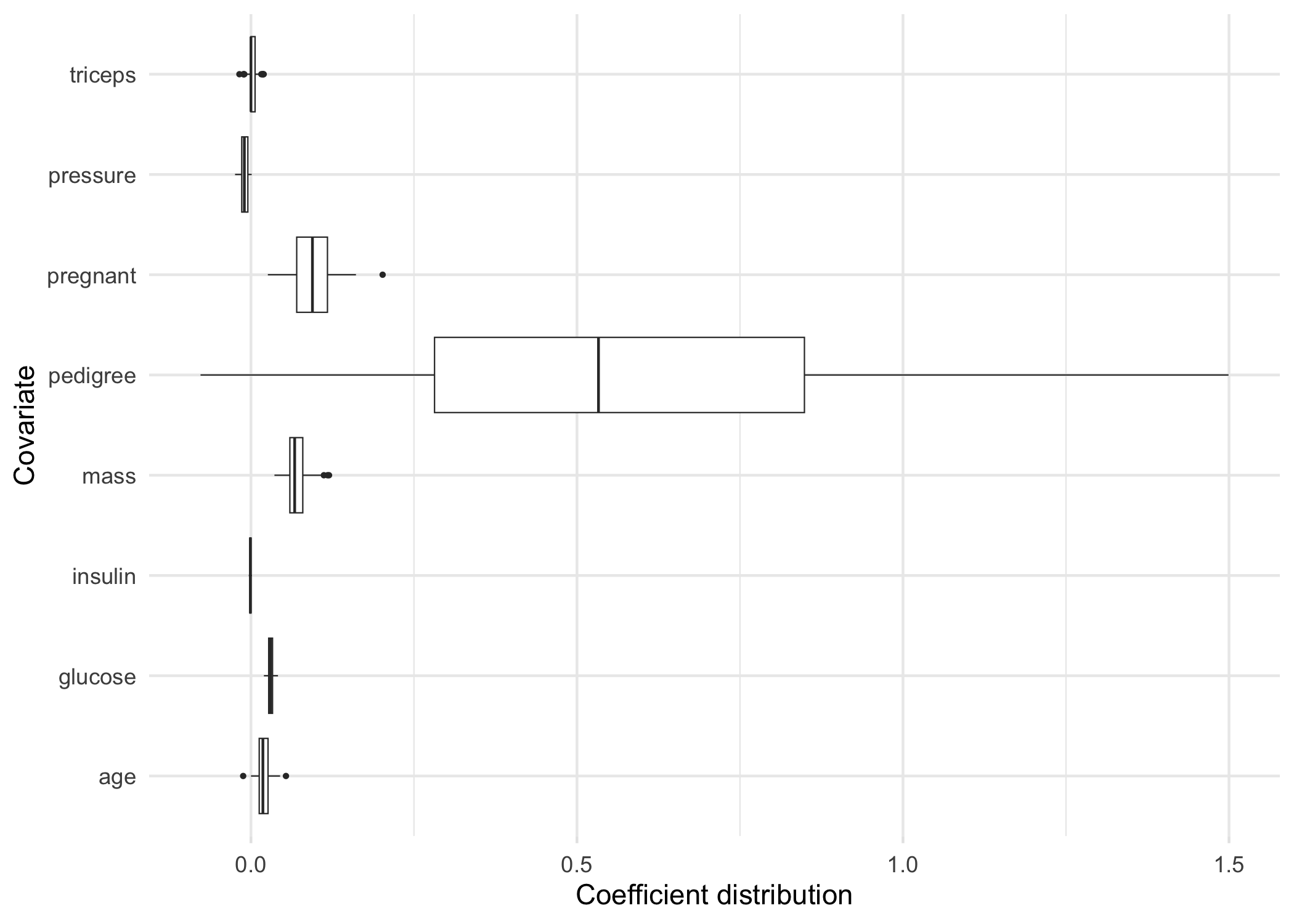 bolasso also supports moving beyond variable selection and understanding the bootstrapped variable coefficients. We can extract a tidy tibble where each variable is a column, and each row represents a bootstrap fold, and the values are the corresponding estimated coefficients.