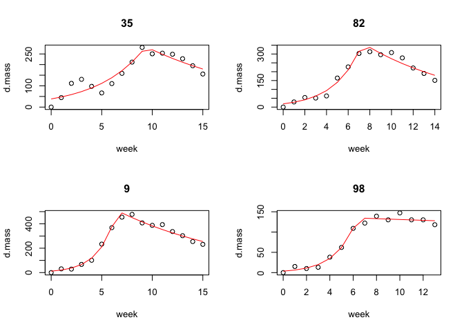 results <- bumbl(bombus2, colonyID = colony, t = week, formula = d.mass ~ week)