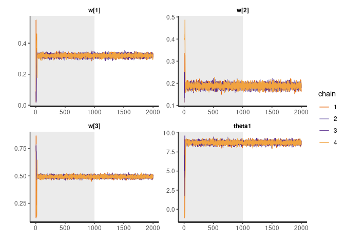 rstan::traceplot(fit, pars = c("w", "theta1"), inc_warmup = TRUE, nrow = 2)