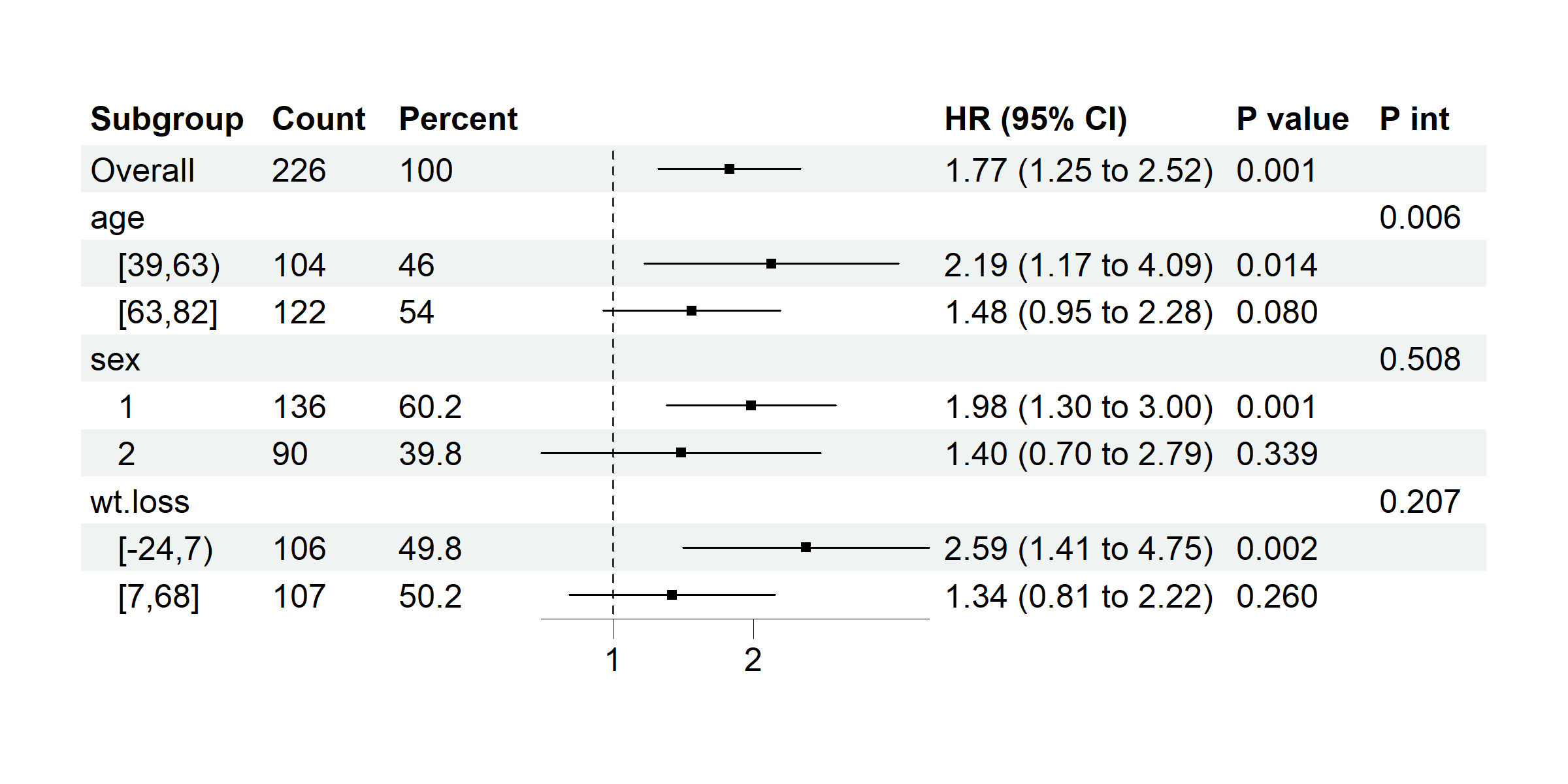 subgroup_vars = c("age", "sex", "wt.loss"), x = "ph.ecog", y = "status",