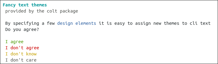 Colt is aimed at package developers that want to create themeable command line output. It is a simple wrapper around the crayon package.