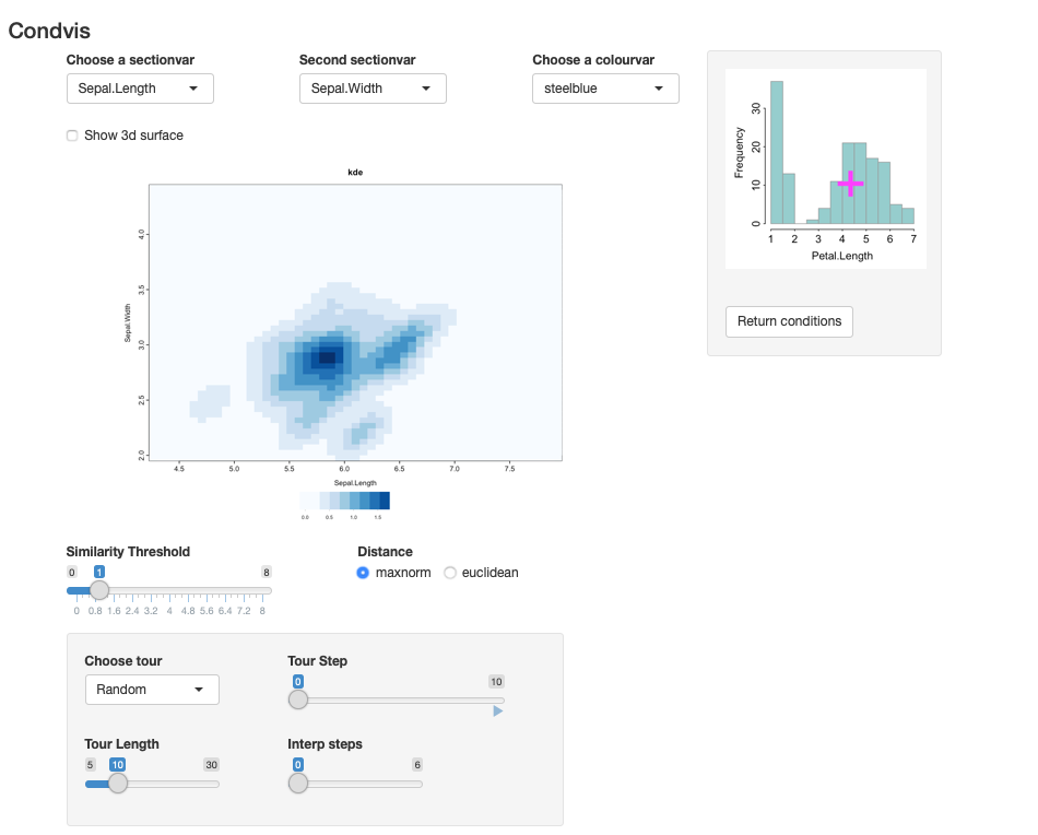 The result is shown in the screenshot below. It shows the estimated density of two variables conditional on the third.