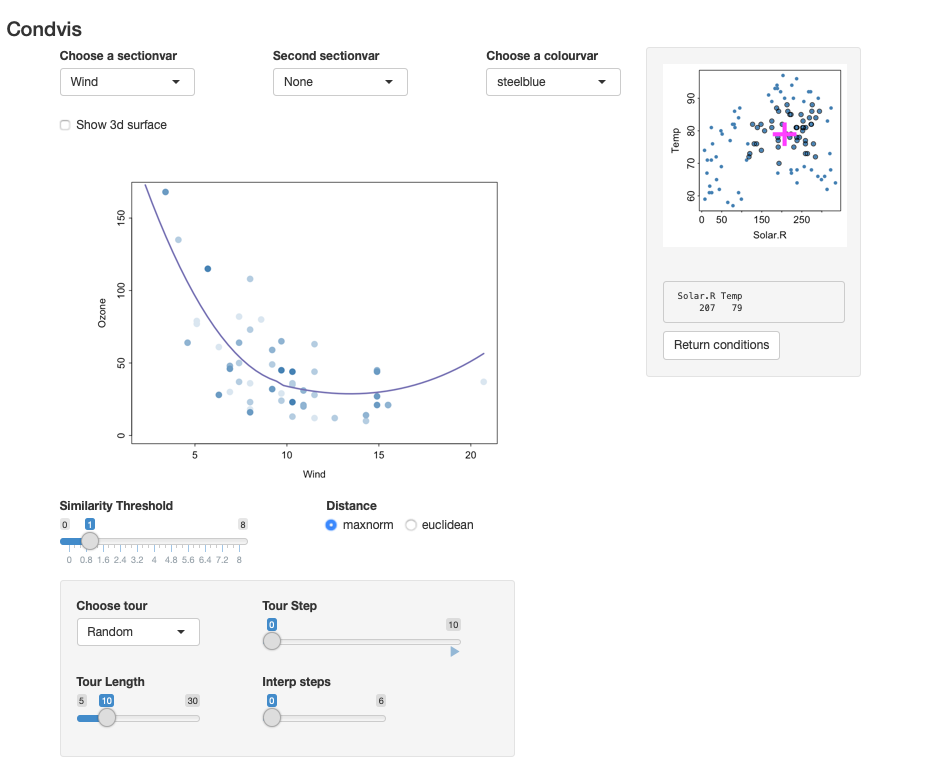 Only observations whose Solar.R and Temp values are near (207,79) are shown. The user can move around the pink cross to see how the prediction varies.