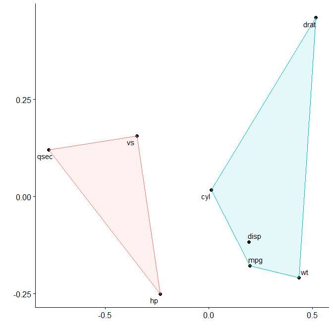 We can see that variables in mtcars cluster together in two separate groups. If we want to highlight this we can request two clusters to be marked.