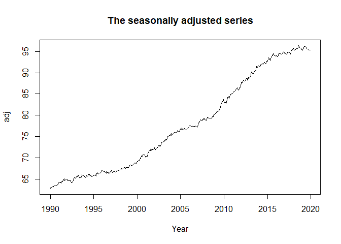 plot(adj, xlab = "Year", main = "The seasonally adjusted series")