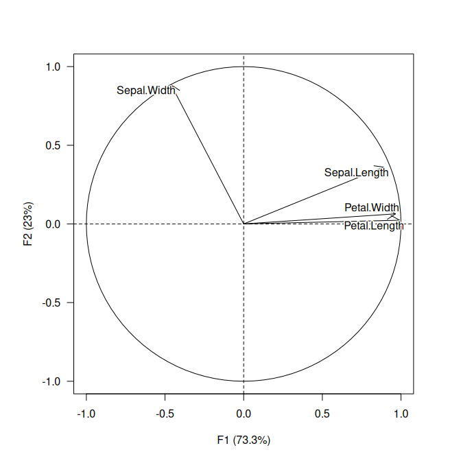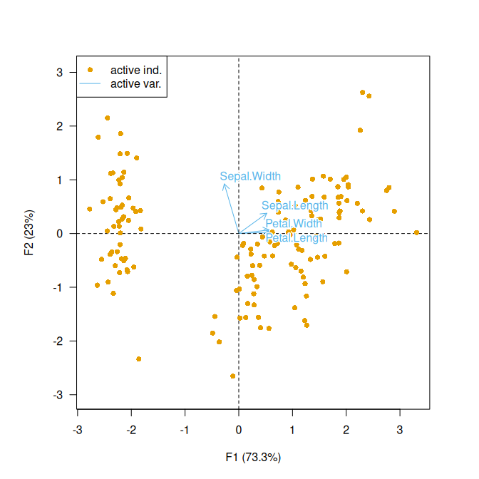 X <- pca(iris, center = TRUE, scale = TRUE, sup_quali = "Species")