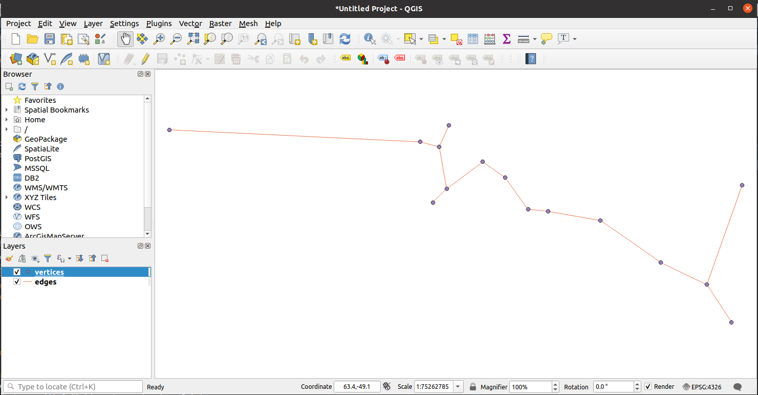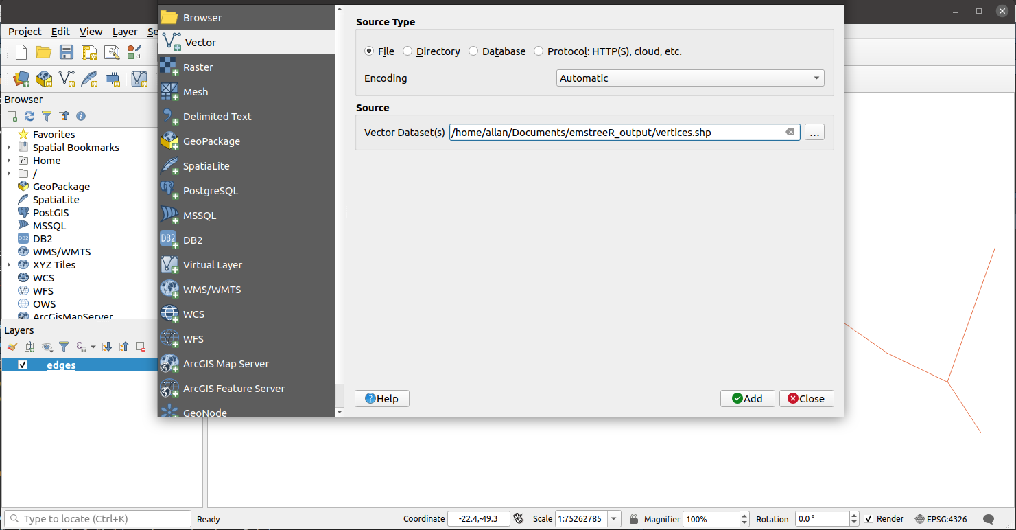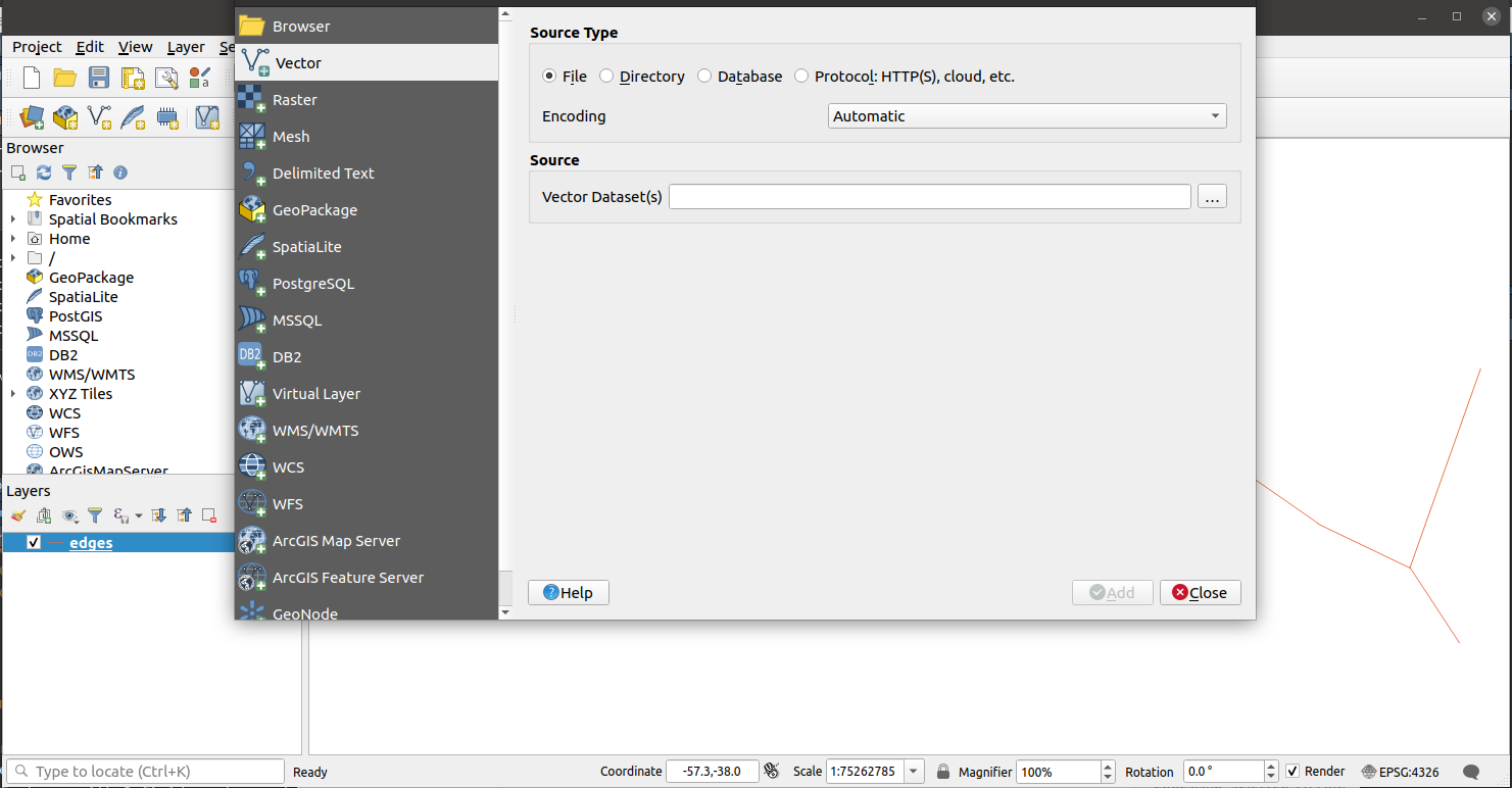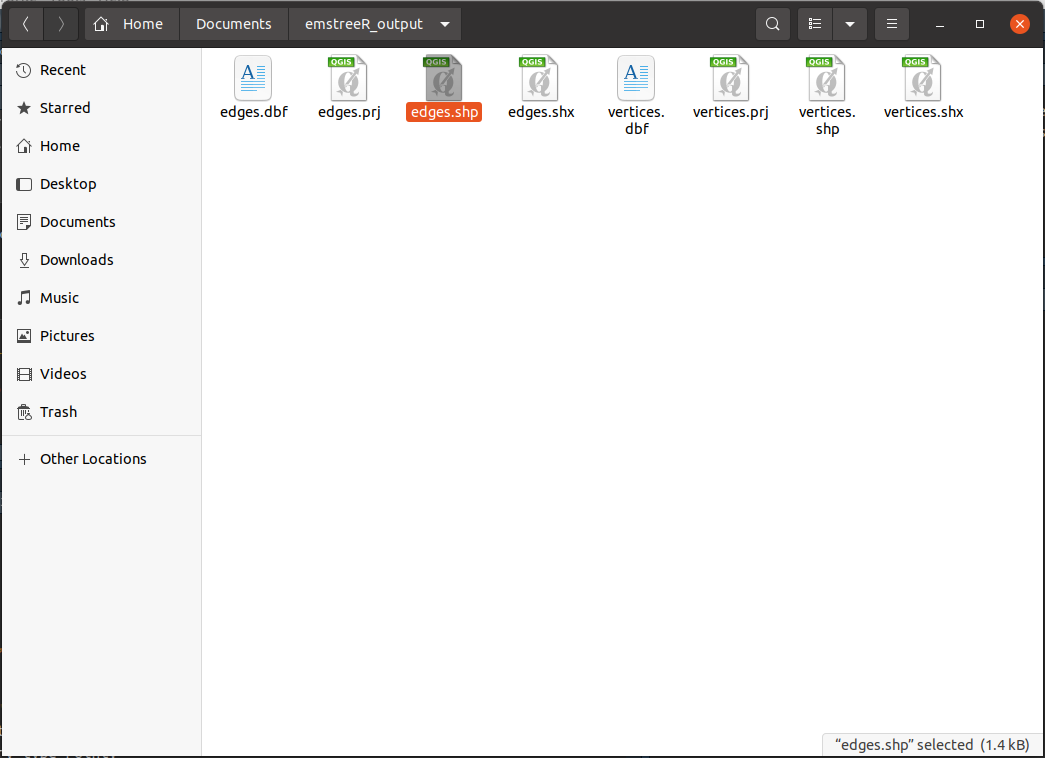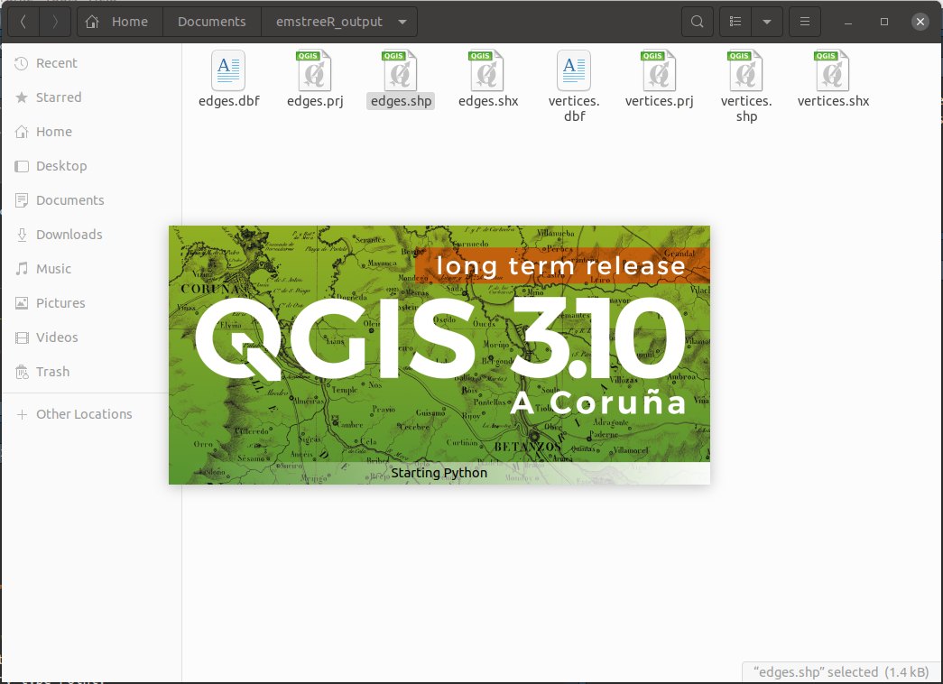 export_edges_to_shapefile(output, file="edges.shp")Below is an example of how to open the shapefiles using the QGIS software in Ubuntu.