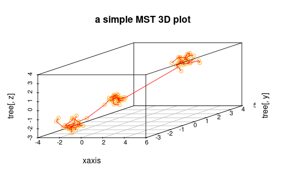 plotMST3D(out, xlab = "xaxis", col.pts = "orange", col.segts = "red", main = "a simple MST 3D plot")
