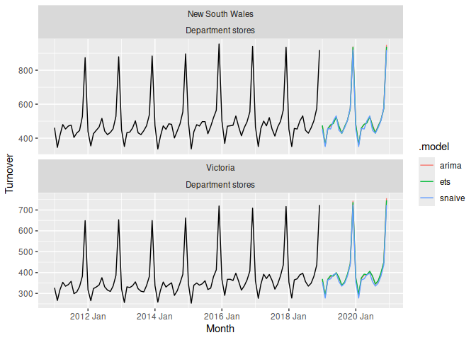 The R package fable provides a collection of commonly used univariate and multivariate time series forecasting models including exponential smoothing via state space models and automatic ARIMA modelling. These models work within the fable framework, which provides the tools to evaluate, visualise, and combine models in a workflow consistent with the tidyverse.