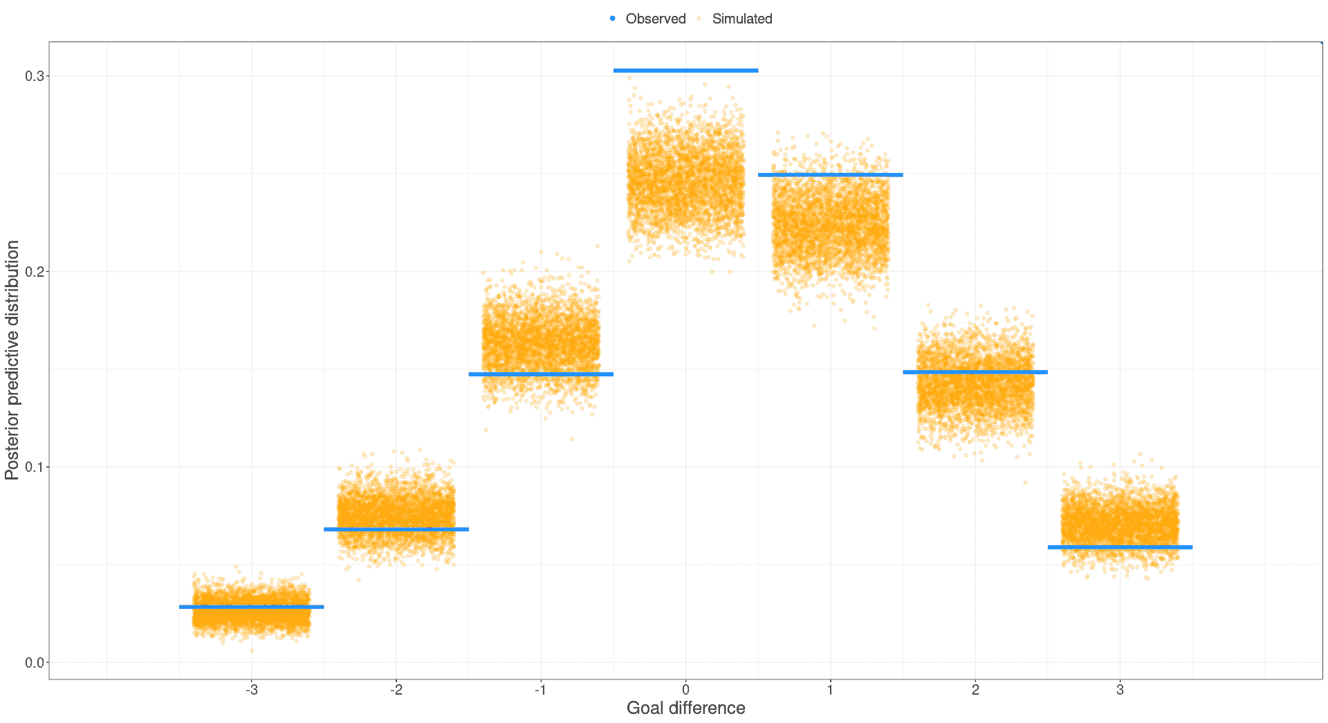 To check the adequacy of the Bayesian model the function pp_foot provides posterior predictive plots
