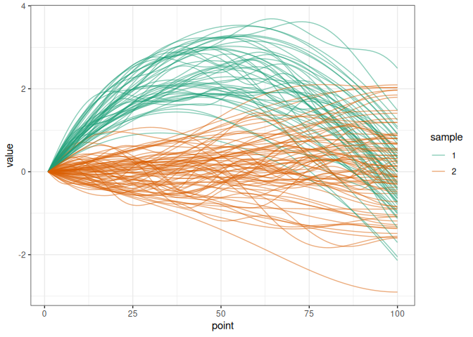 library(funStatTest)We simulate two samples of trajectories diverging by a delta function.